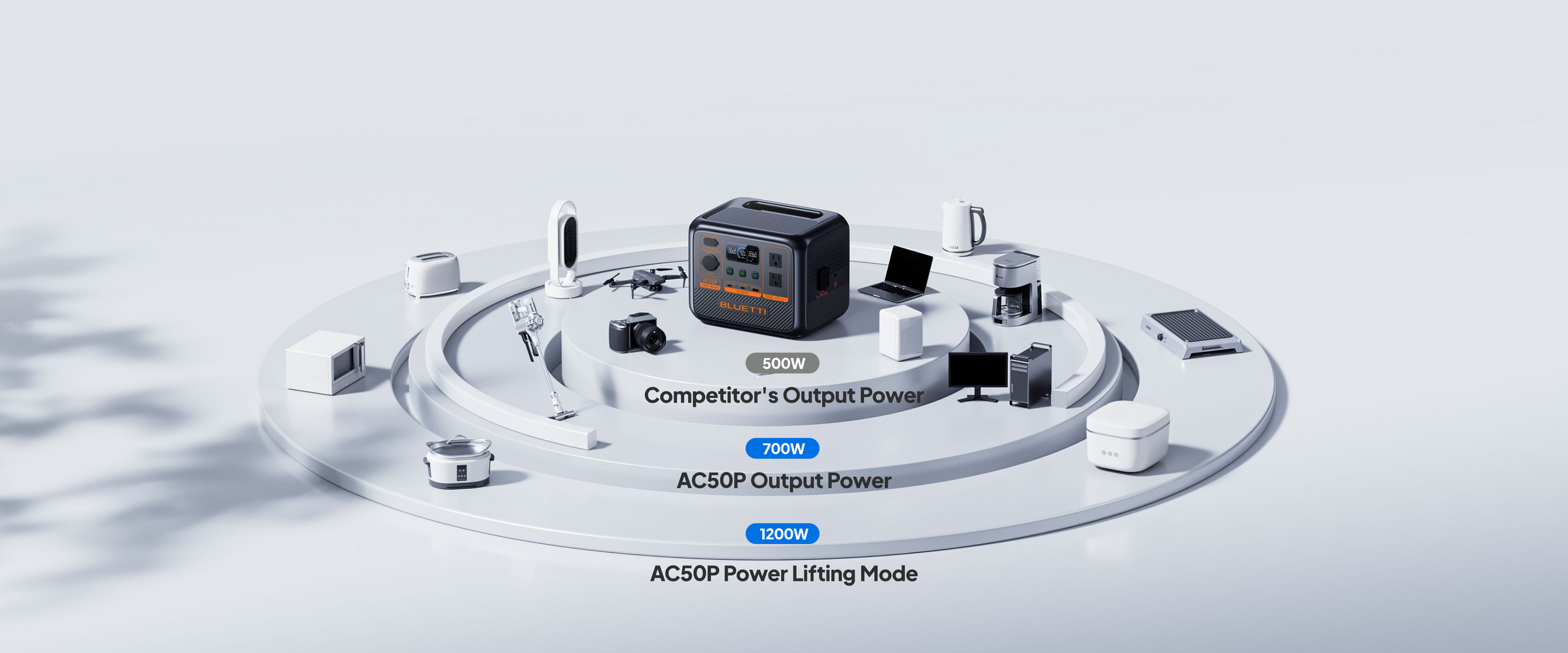 A:AC50P powers appliances up to 700W. The power lifting mode supports pure resistance devices like kettles and irons under 1200W load capacity.