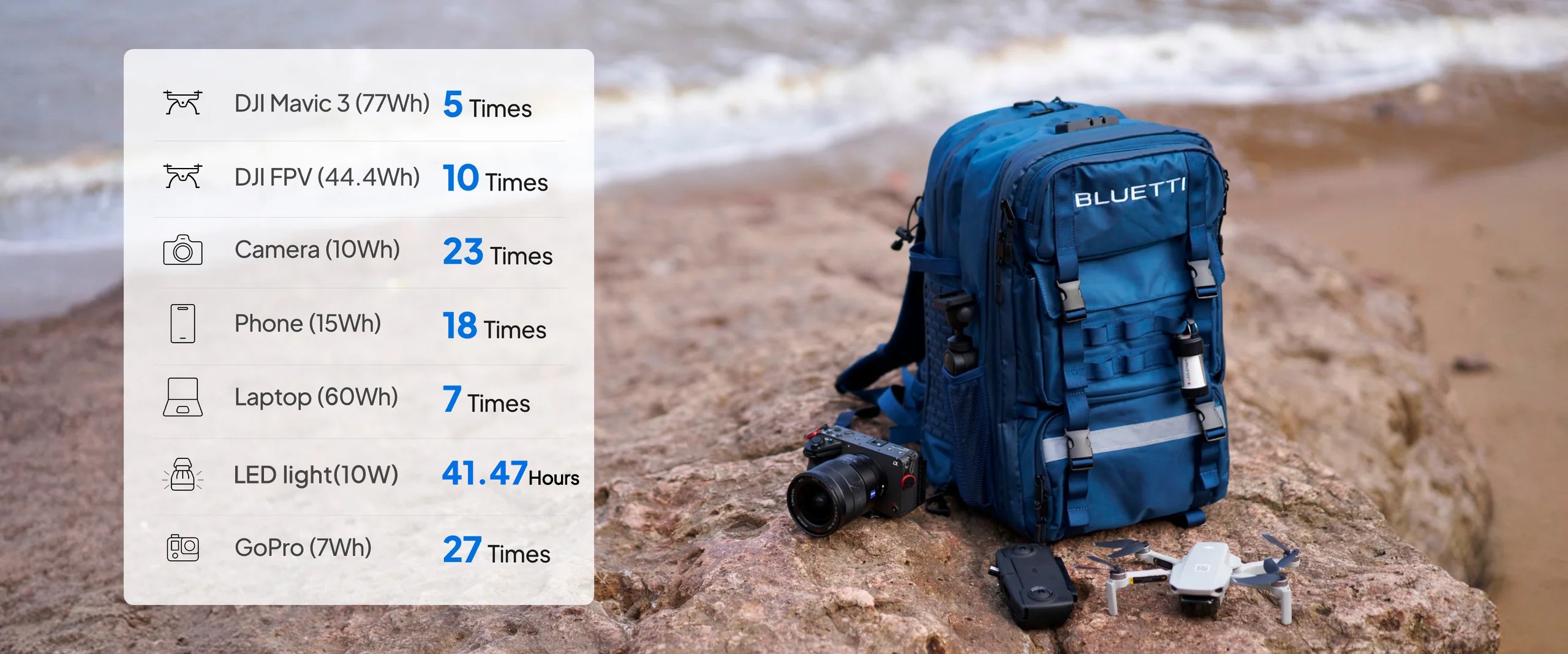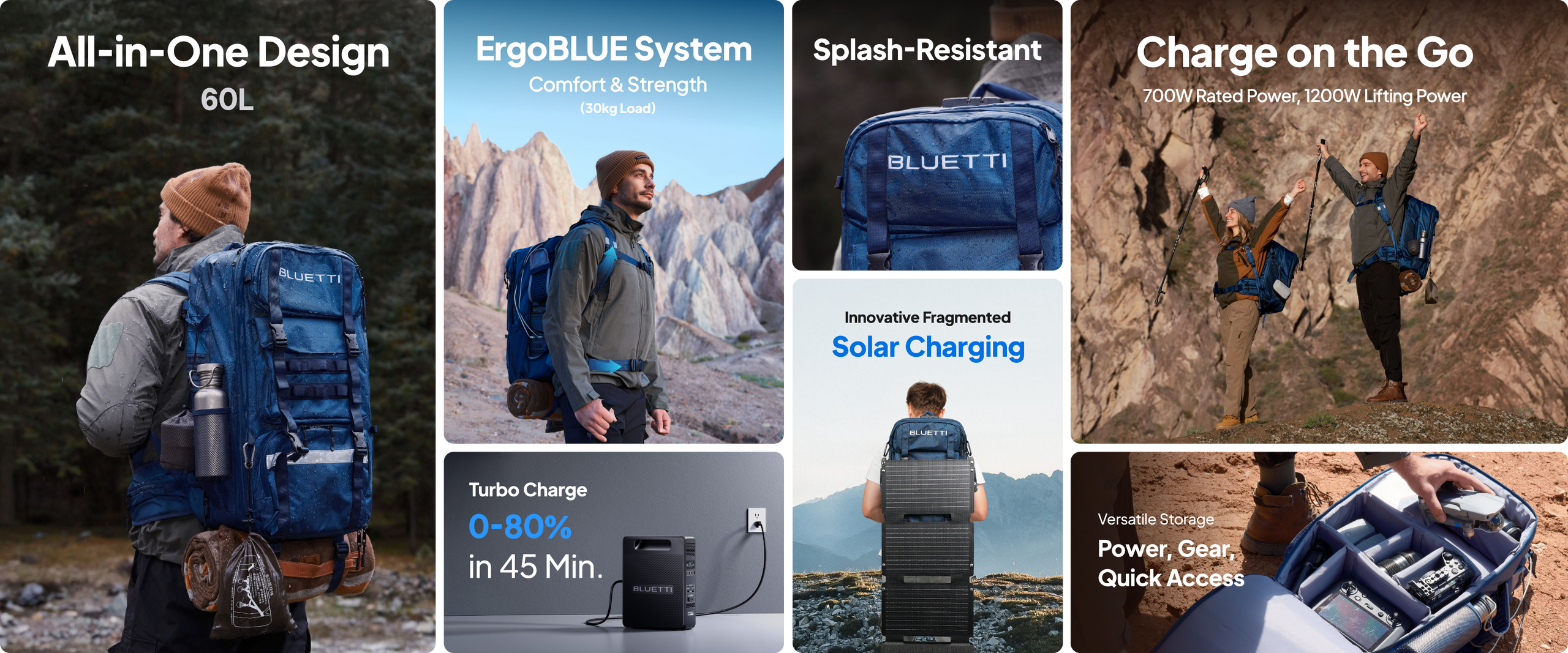 A: The BluePack backpack features a partitioned storage system, allowing you to customize compartments for different devices. The sturdy support frame and base offer strong protection while the tightly wrapped design with extra cushioning effectively absorbs shocks during movement. BluePack can meet all your outdoor storage and power needs. -